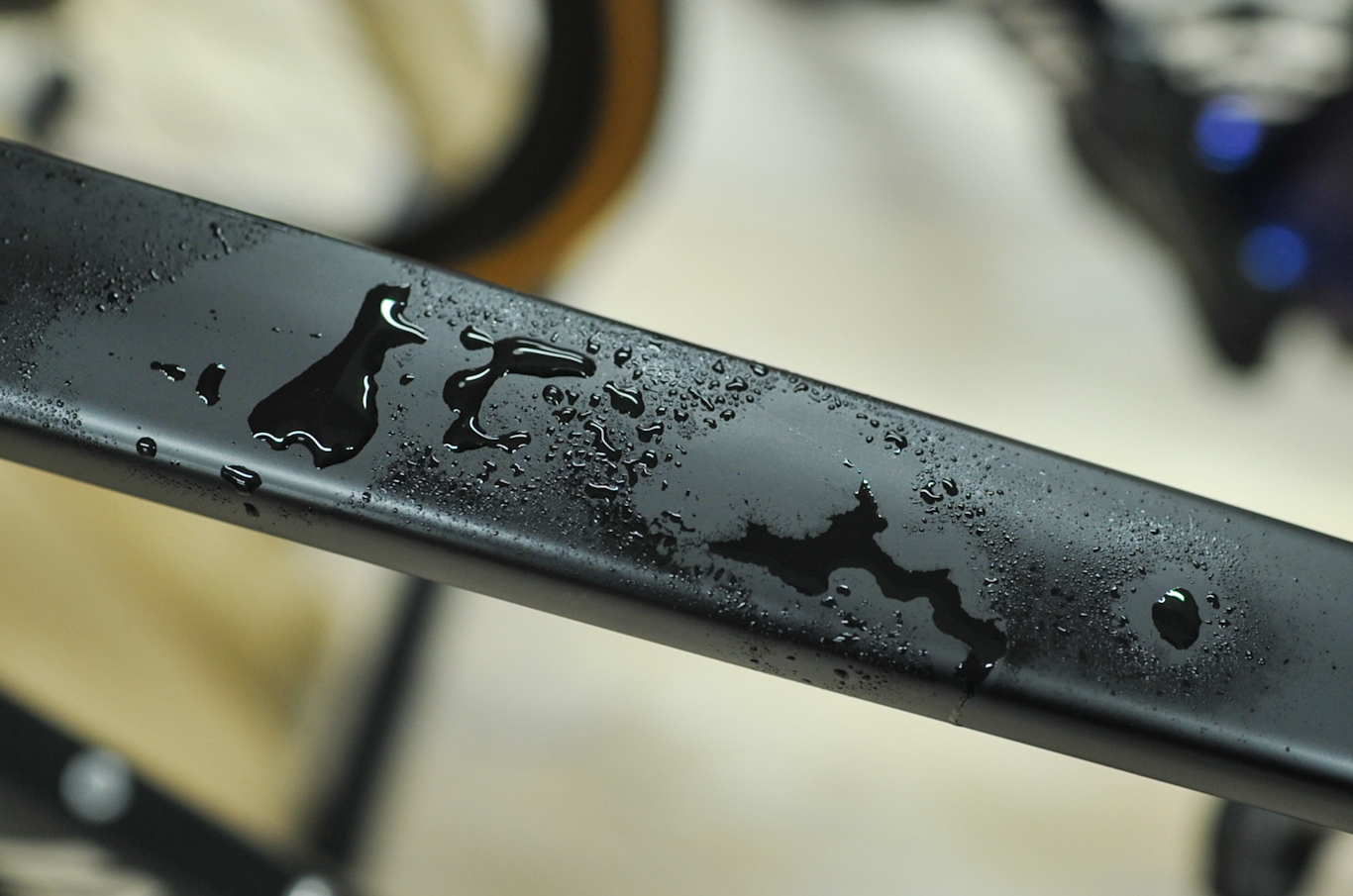 一方で未コーティングのフレームに水をかけると撥水効果が無いため親水状態となり水浸しのようなイメージになります。撥水性が高いとクリーニング等のメンテナンスにも時間がかかりませんし、雨天ライドのアドバンテージにもあるでしょう。是非おすすめです。
