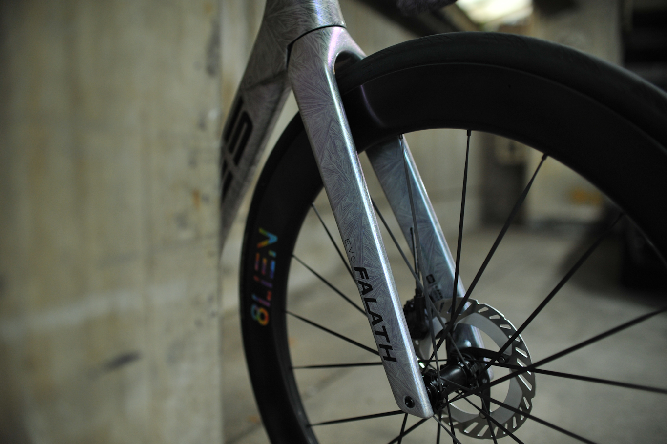 ホイールには、近年徐々に認知度を高めている 8LIEN(エイリアン)カーボンホイール を組み合わせました。FALATH EVOはご覧の通り、非常に先鋭的でアグレッシブなエアロ形状を持つフレーム。その特性を最大限に引き出すため、ワイドリムかつディープリム設計のホイールは相性抜群だと思います。