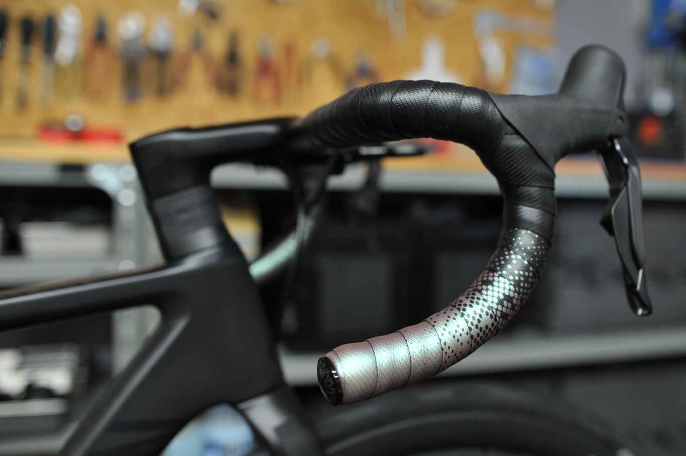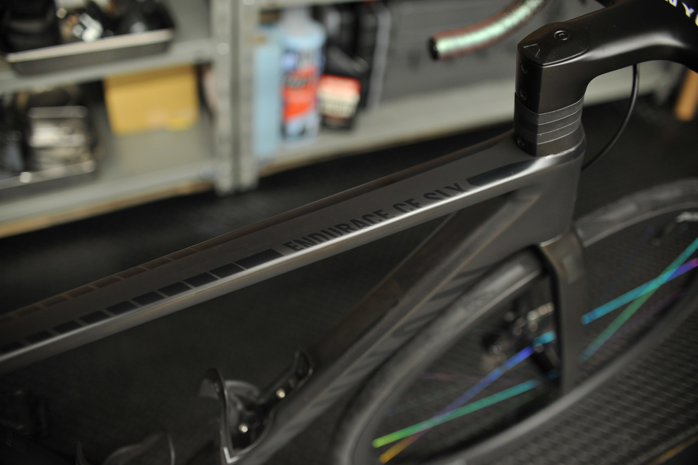 今回のEndurace CF SLXは、マットブラック基調のシックなカラーリングが特徴。落ち着いた佇まいながら、近くで見ると細部の質感や仕上げが際立ち、強いオリジナリティを放っています。そこへ特徴的なホイールやバーテープを組み合わせることで、全体の雰囲気にしっかり個性をプラスしています。
