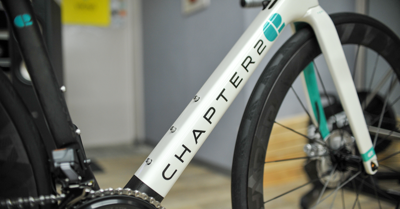 フレーム形状は、当時のカーボンロードとしては主流だったトップチューブが水平なホリゾンタルデザインを採用。クラシカルでありながら、CHAPTER2らしいモダンさを併せ持つ独特のシルエットが特徴です。