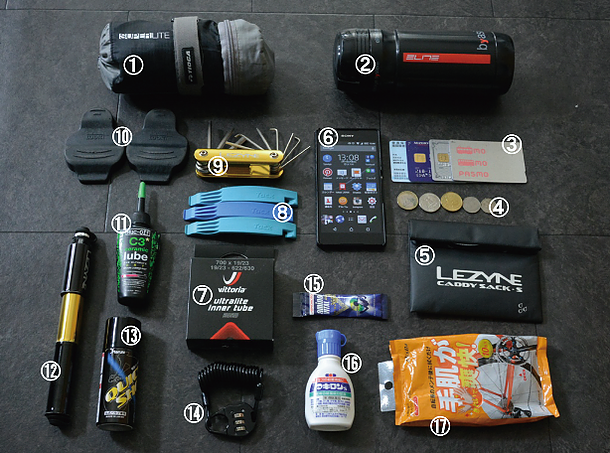 グループライドの時はメンバー間でアイテムを分散するのも賢い方法です。ひとつあれば十分なものとして、⑫携帯ポンプ、⑨携帯工具、⑯消毒液あたりではないでしょうか?