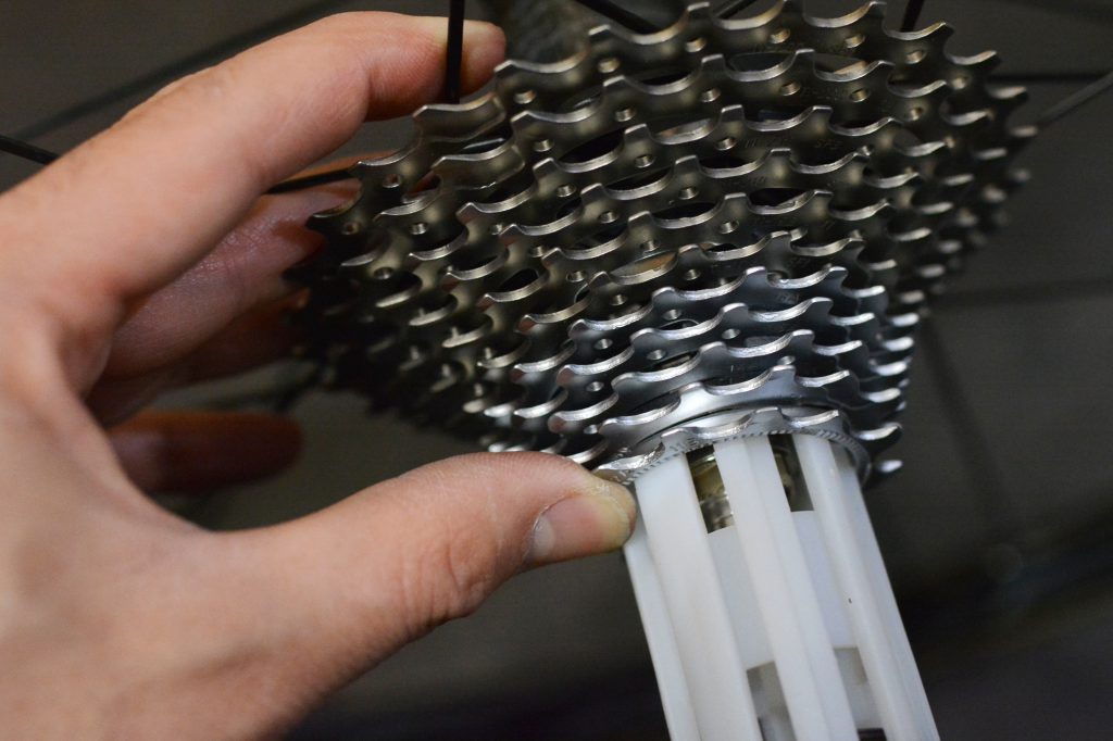 スプロケットを押し込むと、白いパーツが押し出されてスプロケットがフリー体にしっかり装着されます。